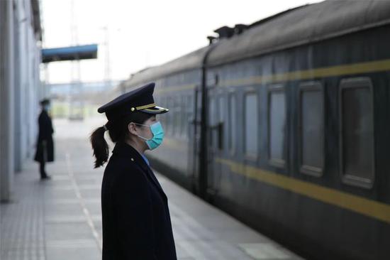 16时30分,湛江至北京西K158次列车即将进站,车站客运员准备立岗接车。目前尚有10趟客运列车经停孝感站,少数下车的旅客包括医护人员、军人等。这一天的K158次列车没有旅客下车。