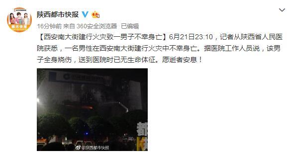 6月21日23:10,记者从陕西省人民医院获悉,一名男性在西安南大街建行火灾中不幸身亡。据医院工作人员说,该男子全身烧伤,送到医院时已无生命体征。愿逝者安息!