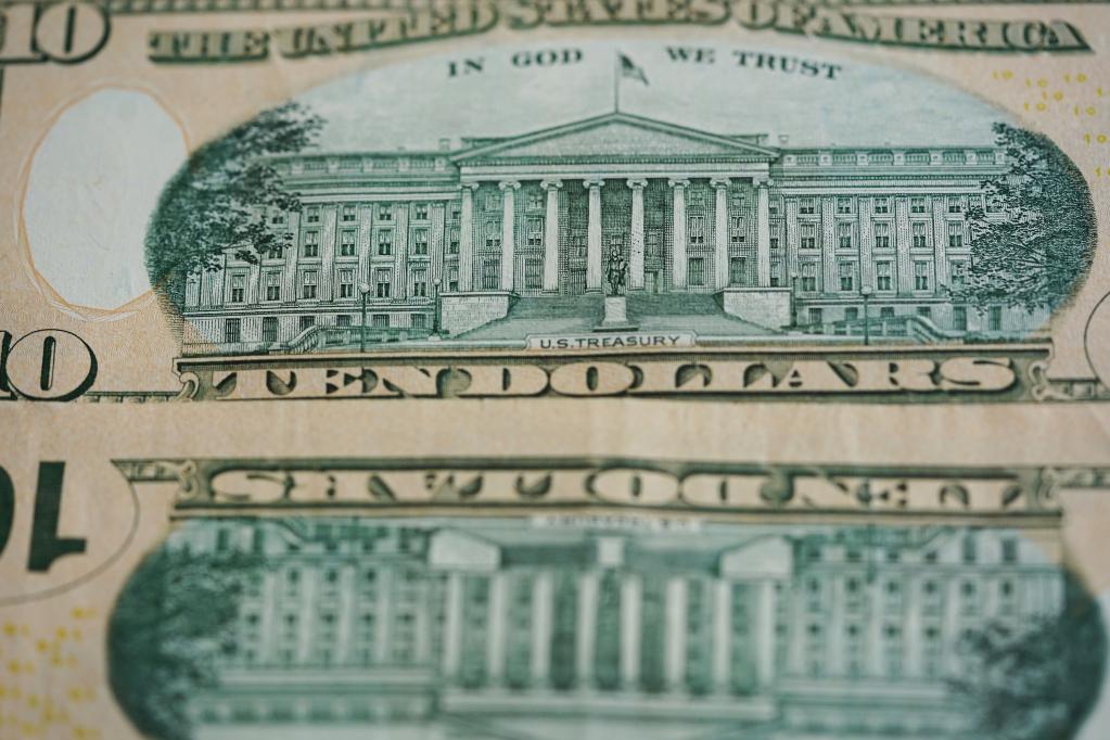 这是2020年4月29日在美国首都华盛顿拍摄的美元纸币上的美国财政部大楼。(新华社记者刘杰摄)
