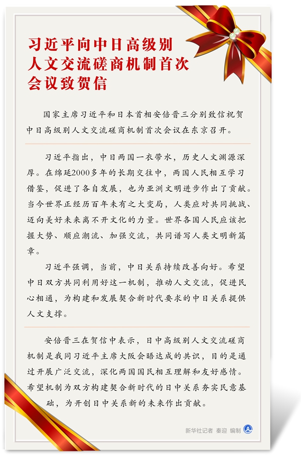 图表:习近平向中日高级别人文交流磋商机制首次会议致贺信新华社记者秦迎编制
