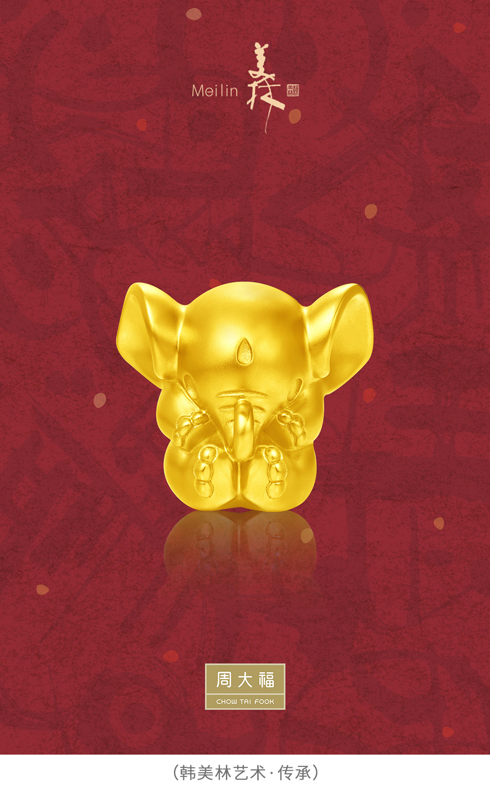周大福传承以铸造、錾刻、锤揲、花丝、镶嵌、烧蓝、雕漆、玉雕、景泰蓝九大黄金工艺为依托,以千年前的符号、图案、文化为设计元素,融入中华优秀文明,延伸出五大子系列。