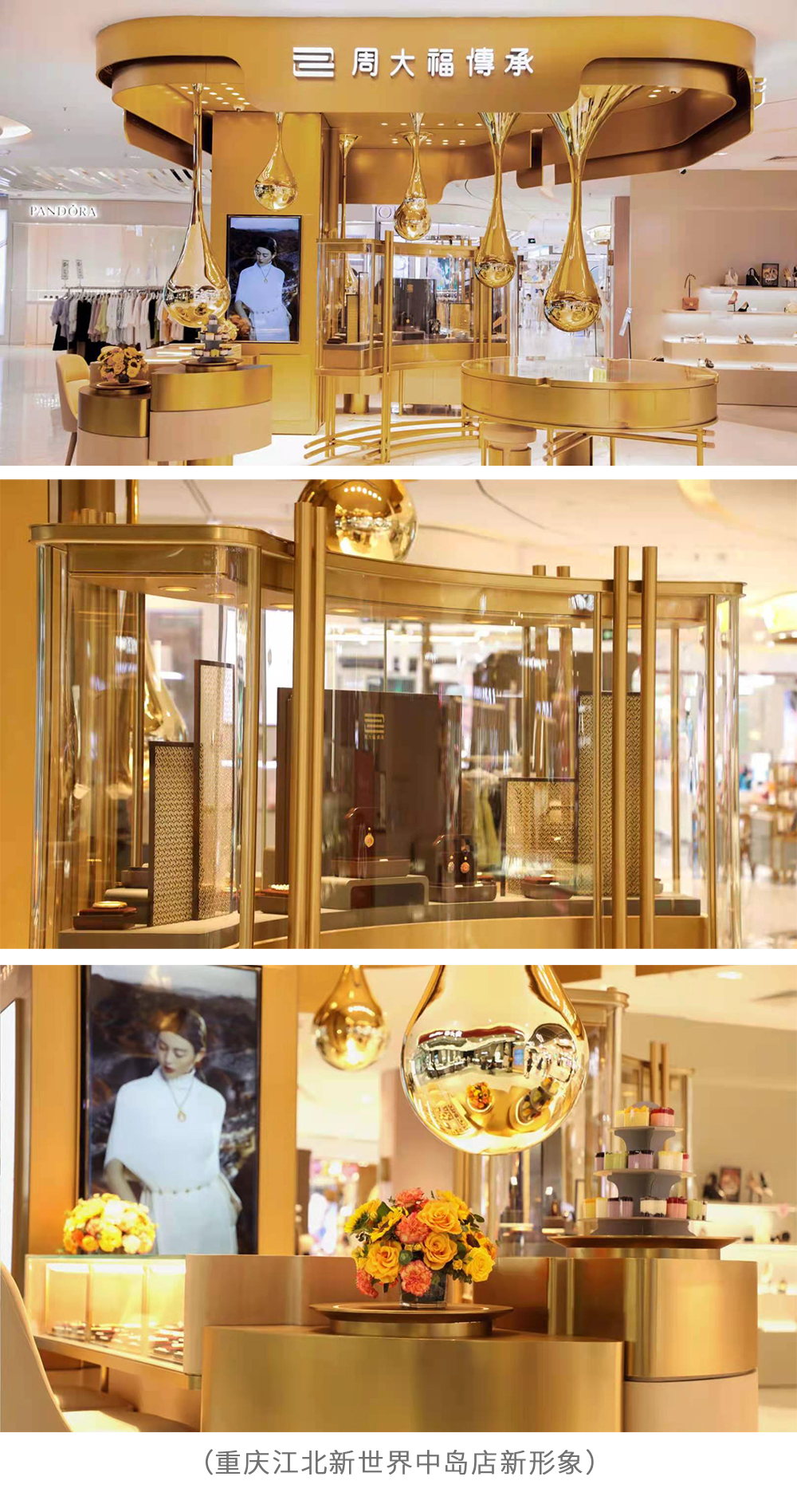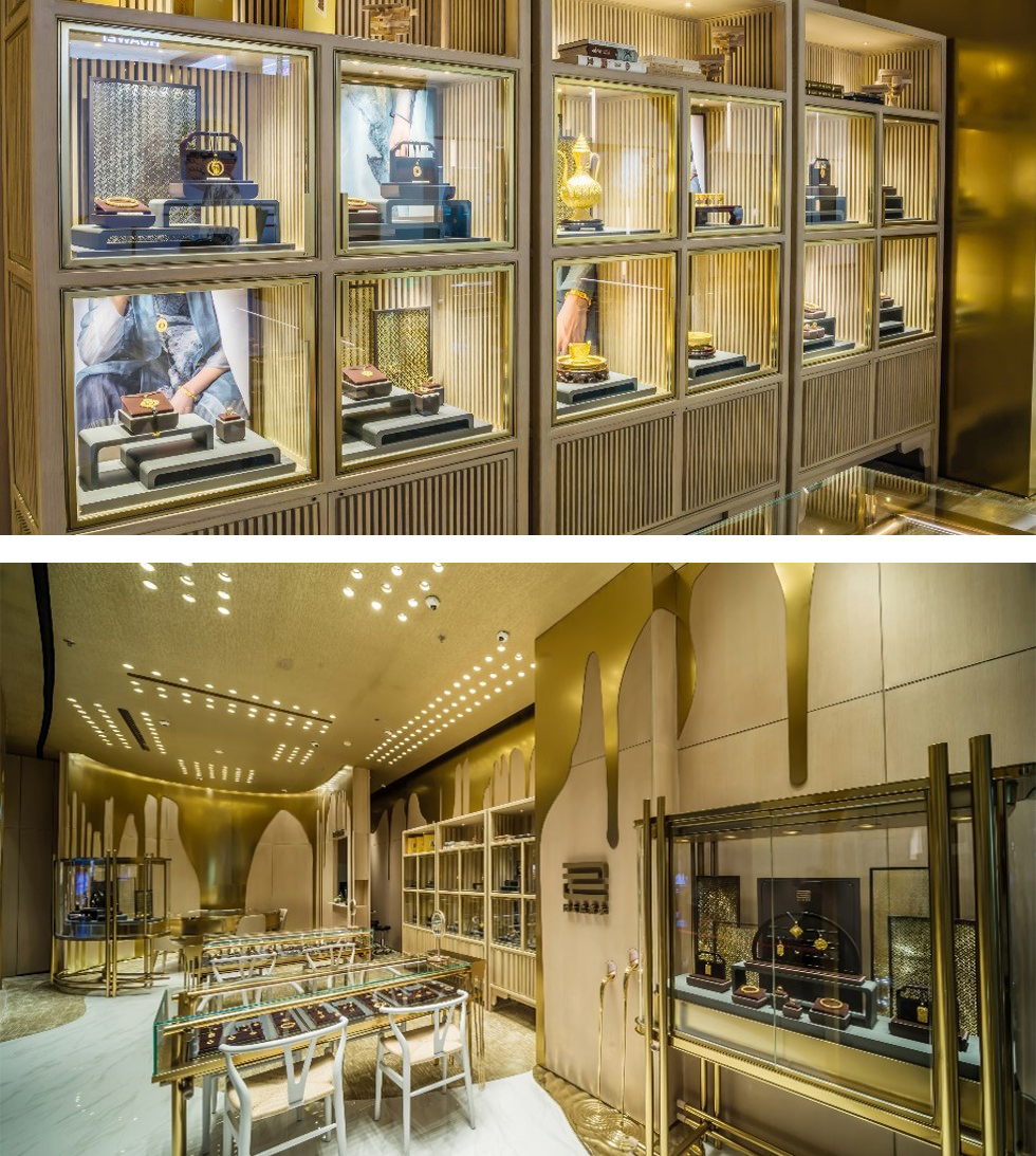 无论是产品,还是服务,周大福传承都在努力创新和不断提升。针对不同的区域性市场与人群、适应不同的消费购物场景,周大福传承专营店也在不断升级和丰富着店面形象,希望能为顾客带来更加丰富的视觉体验以及更加优质的购物氛围。2021年8月,面对以文化著称的重庆,并为了更好匹配江北新世界的购物环境,除继续延续传承理念,加筑经典底蕴,更是大胆应用“鎏金滴落”的效果,在立体化呈现下更令人震撼,所使用的镜面金,造型独特、质感不凡。