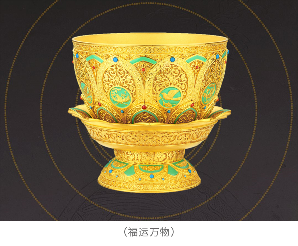 如来敦煌·传承,重走丝绸之路,用黄金铸造、花丝与珐琅工艺呈现敦煌沉淀至今的艺术风采。
