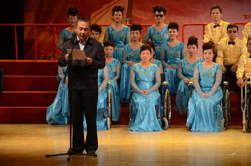 《抗战组歌》专场演出以抗战歌曲为主题,以肢体、视力、听力残疾人为主要演员,共分为刻骨铭心、血战沙场、展望胜利、和平万岁四个章节,在雄壮的《义勇军进行曲》中拉开帷幕,《松花江上》、《太行山上》、《保卫黄河》《大刀进行曲》、《地道战》、《军民大生产》、《军民同抗战》、《没有共产党就没有新中国》、《和平放歌》、《中国梦》等歌曲让大家重温了那段刻骨铭心的历史和激情燃烧的岁月,全国劳动模范、三秦楷模、著名歌唱家贠恩凤的《山丹丹开红艳艳》、《抗日将士出征歌》、《拥军秧歌》将整场演出推向高潮,最后在《歌唱祖国》高亢激昂的歌声中圆满结束。 省残联宣文部调研员孙小平、西安市残联副理事长何永国、延安市残联理事长姬涛及延安八一敬老院全体老战士、老同志、市区部分残疾人代表等500多人观看了演出。(赵东红)