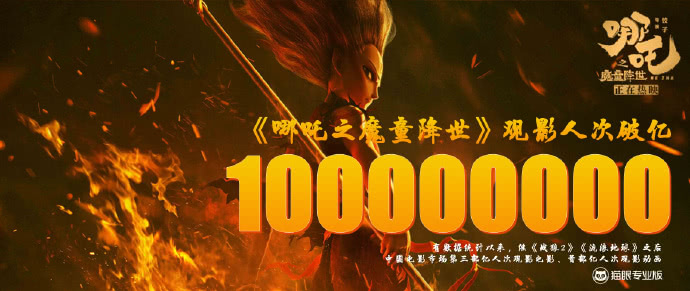 它也就此成为继《战狼2》《流浪地球》之后,内地有数据统计以来第三部观影人次破亿的电影。同时,也是首部观影人次破亿的动画电影。