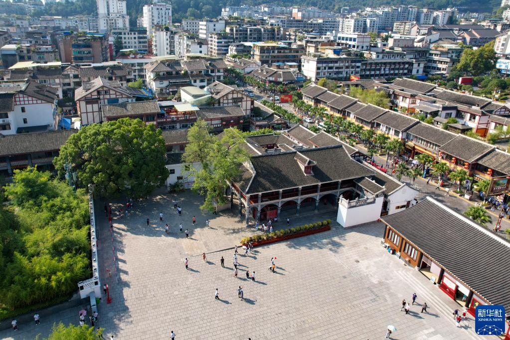 10月1日,游客在贵州省遵义市遵义会议会址参观(无人机照片)。