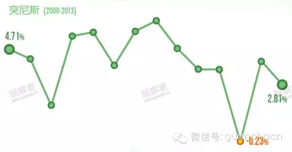 可以看到,2011年突尼斯的GDP增长率同样落在最低谷。短短两年中,权力更迭频繁,通货膨胀率持续上升。
