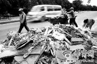 “这些垃圾应该是凌晨倒的,基本没人能看到。”昨日下午2时许,吴雪和她的两名同事正清扫着路上偷倒的垃圾,其中木板、碎布、水泥块、棍棒……应有尽有。“今天还算少的,倒了两堆,上午已经清理了一堆。多的时候能有五六堆,几乎覆盖整个路面,如果不马上清理,车都过不去。”吴雪说,她负责这段路一年多的时间,几乎每天都会有这额外的活儿。吴雪的同事席大妈说,清运这些垃圾得让她们每天多花费一两个小时。