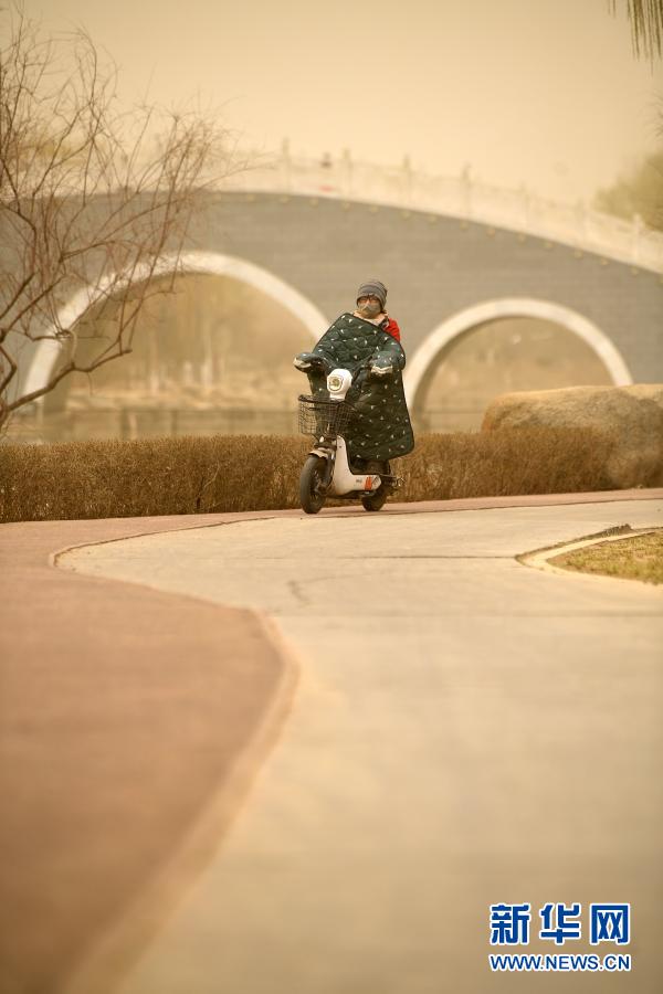 在宁夏银川市海宝公园,市民在沙尘中骑行(3月16日摄)。