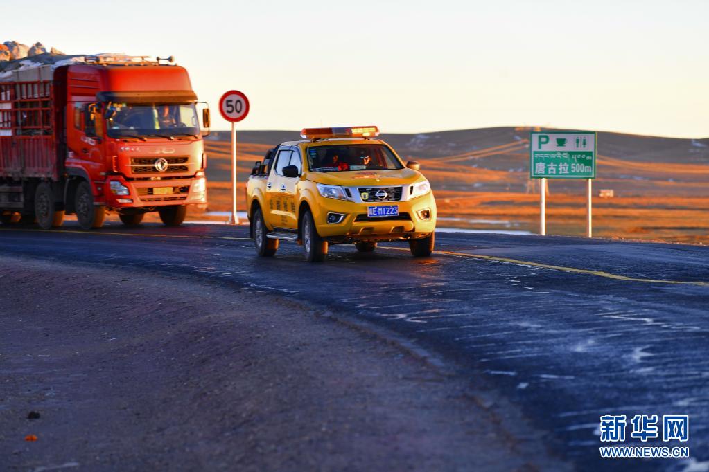 安多公路养护段巡护车和一辆货车行进在国道109唐古拉山口路段(1月13日摄)。新华社记者张汝锋摄