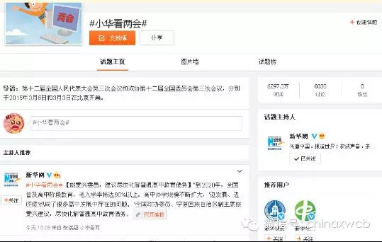 新华网的“小华”以#小华看两会#的姿态于3月2日在其新浪官方微博亮相。两会期间,“小华”的主要工作就是在微博上发布两会快讯。截至3月9日21时,由“小华”负责的#小华看两会#已经达到6006万次话题阅读量。