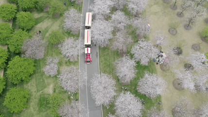 “钟花樱”是产于我国本土的早樱品种,因盛放的花朵呈深红色,被称为樱花中的“中国红”,寓意着用自己的努力绽放为人们带去希望。在辰山山顶,三位医护还敲响了祈福的钟声,将最美的心意送去远方。