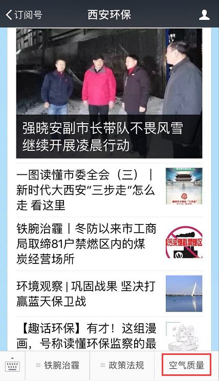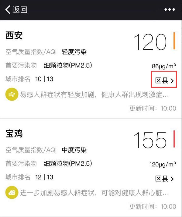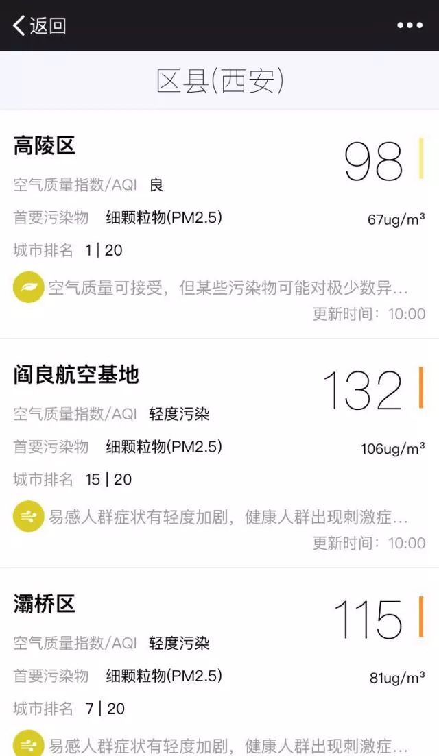 进入“西安环保”点击右下角“空气质量”板块,就可以看到陕西省各城市空气质量状况,再点击所在城市界面右侧的“区县 > ”就可以查到所辖各区县的空气质量状况。
