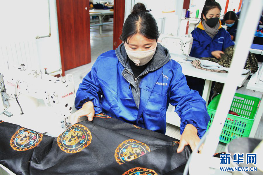 绣娘们正在缝制藏袍。新华网 马洪婷摄