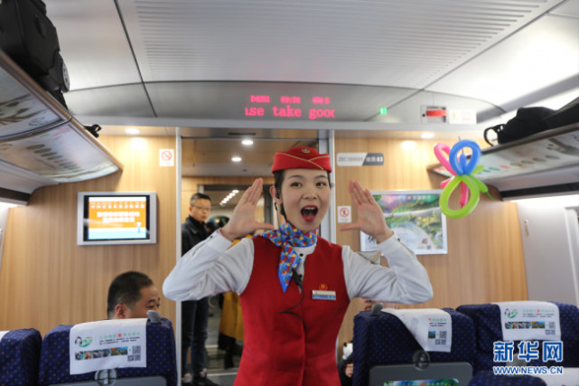 西成高铁乘务员带领旅客一起做“熊猫减压操” 新华网 杨喜龙 摄