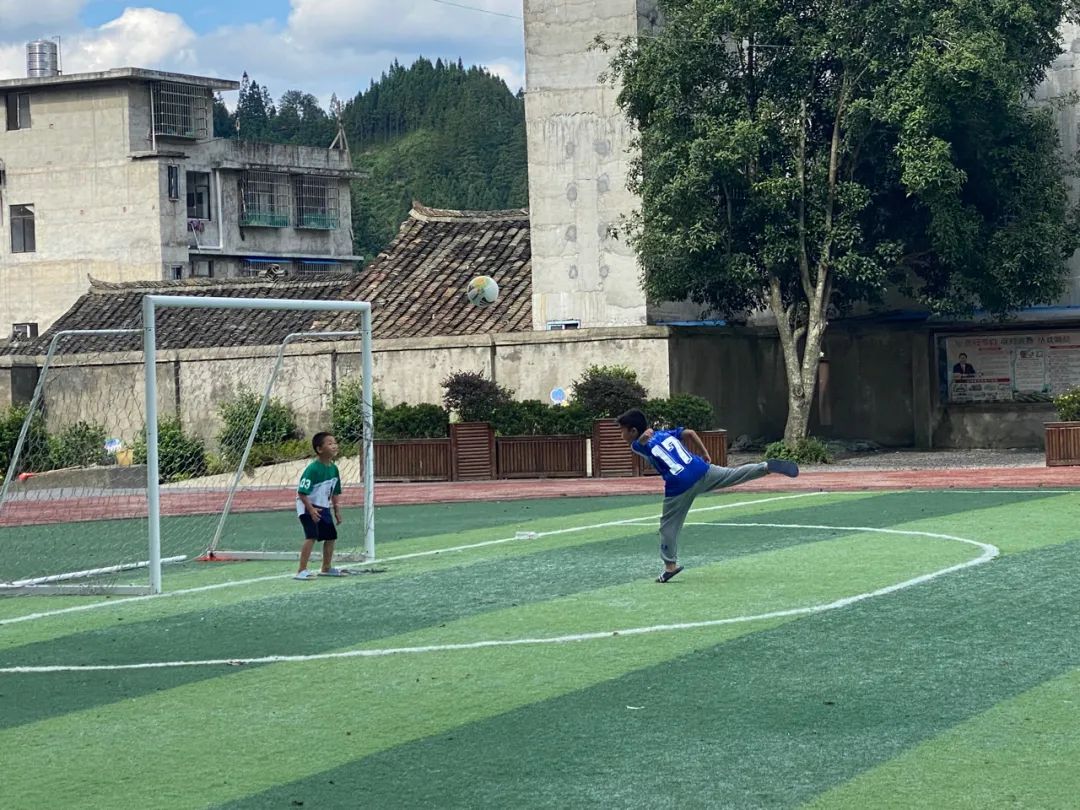 正值暑假,在榕江县一所小学的足球场上,王同学和钱同学正在踢足球。今年七岁的王同学刚刚幼儿园毕业,平时爱看足球,也爱踢足球,“长大以后,我也要踢‘村超’!”今年十二岁的钱同学则是小学足球校队的成员,也常常看“村超”比赛,“希望以后能代表校队拿到一个冠军。”