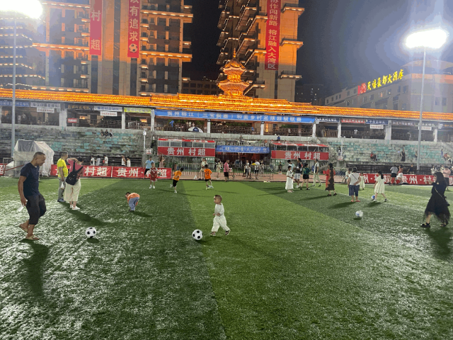 在比赛间隙和结束后,观众席上的孩子们会冲进球场,玩起传球、盘带和射门;工作日的晚上,“村超”体育场上,有很多踢球的身影,有中学足球队的队员,有八九岁的小学生,还有刚刚学会走路的小朋友。