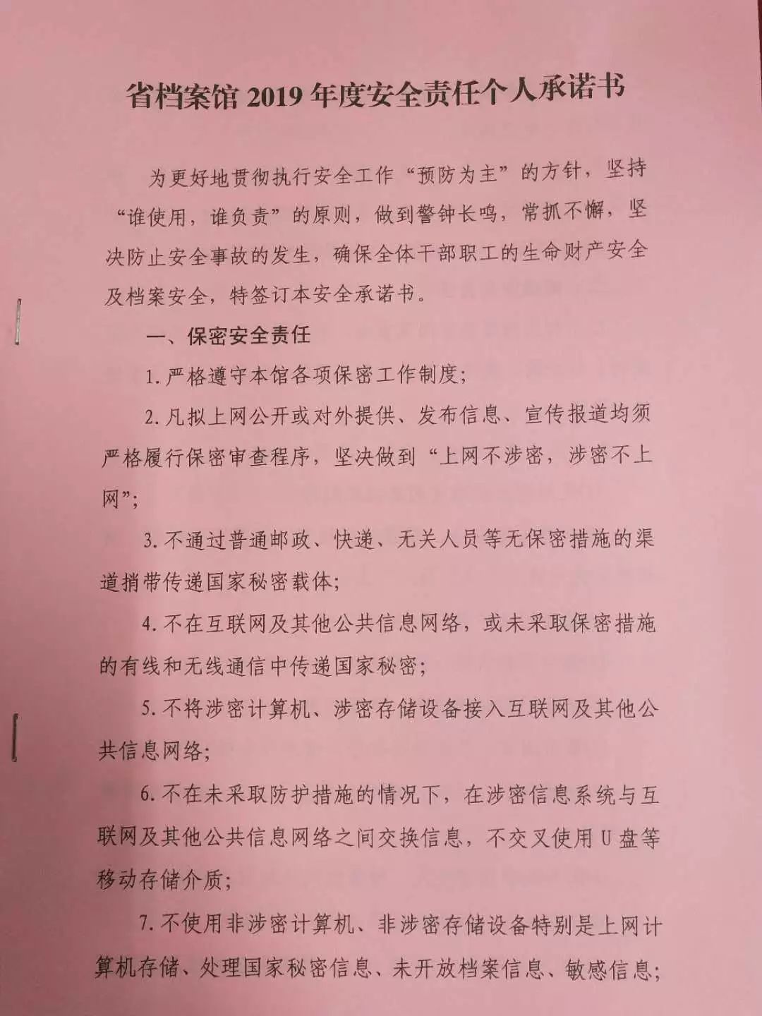 12月19日,省档案馆(局)召开了“讲政治、敢担当、改作风”专题教育动员大会,明平英局长主持,各处处长带头签署了《省档案馆2019年度安全责任处长承诺书》,会后,全体干部职工共同签署了《省档案馆2019年度安全责任个人承诺书》,档案安全责任人人有责——这是省档案局在安全防范工作中的一项创新举措。