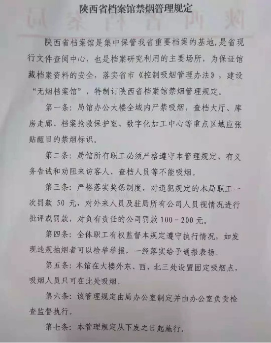 2018年以来,省馆(局)制定完善了《陕西省档案馆(局)网络与信息安全事件应急预案》《陕西省档案局网络与信息安全事件应急演练方案》《陕西省档案行业网络与信息安全信息通报工作规范》《陕西省档案局网络与应用系统管理制度》《陕西省档案局机房管理制度》等。2018 年11月15日,《西安市控制吸烟管理办法》正式开始实施,几天后,省档案馆(局)在原有制度基础上,经过征集意见,修订出台了《陕西省档案馆禁烟管理规定》,被同志们戏称为“史上最严禁烟令”:严禁在办公楼吸烟,一经发现,不仅对吸烟个人进行处罚,所在处室也将取消全年评先资格。这一“连坐制度”,加深了大家集体监督意识,让吸烟者不得不考虑集体利益而禁烟。