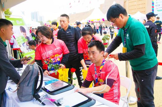 赛后,还能享受一场全身放松的拉伸服务,细致且周到;云南白药泰邦健康生活体验中心,免费提供眼部呵护、足部检测、颈肩腰腿部理疗服务,提供科学的运动护理方案,让跑者畅快运动,无惧损伤