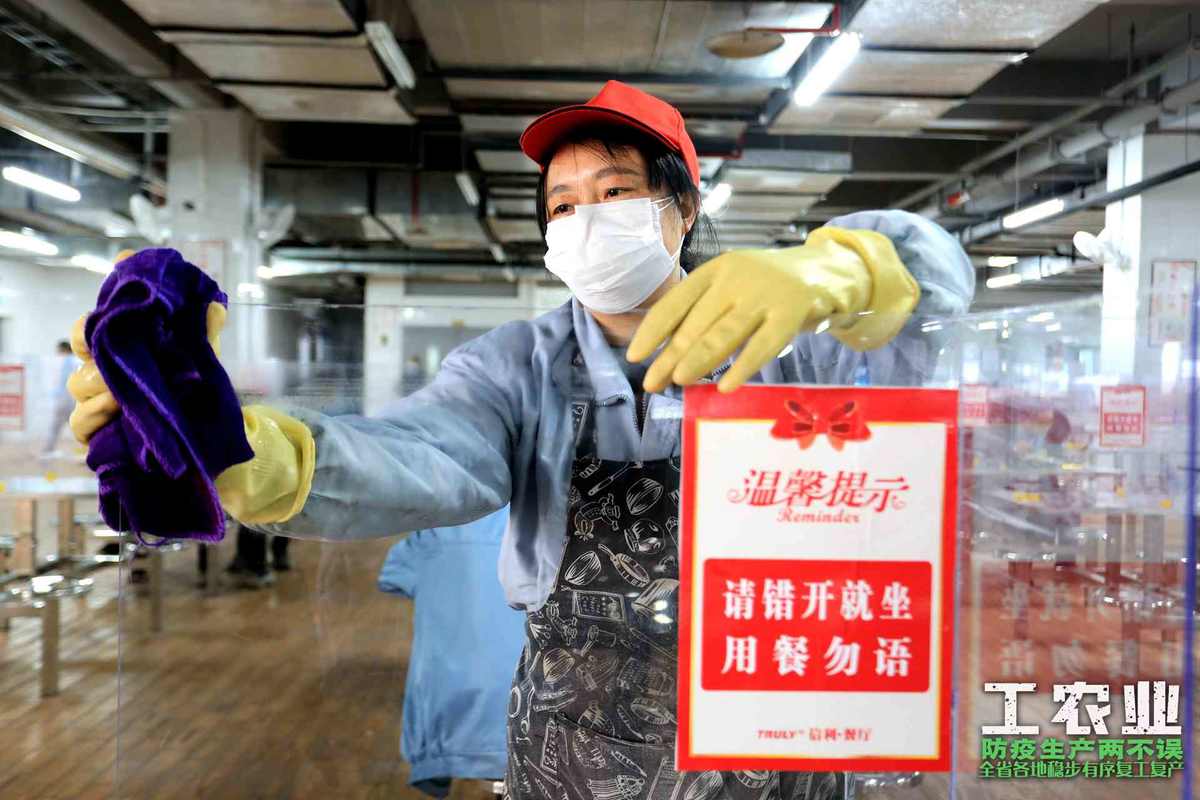 眉山信利仁寿高端显示科技有限公司,职工食堂工作人员正在保洁餐桌。