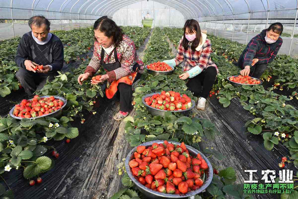 绵竹市嘉宇家庭农场的管理员正在为德阳市场采摘草莓。