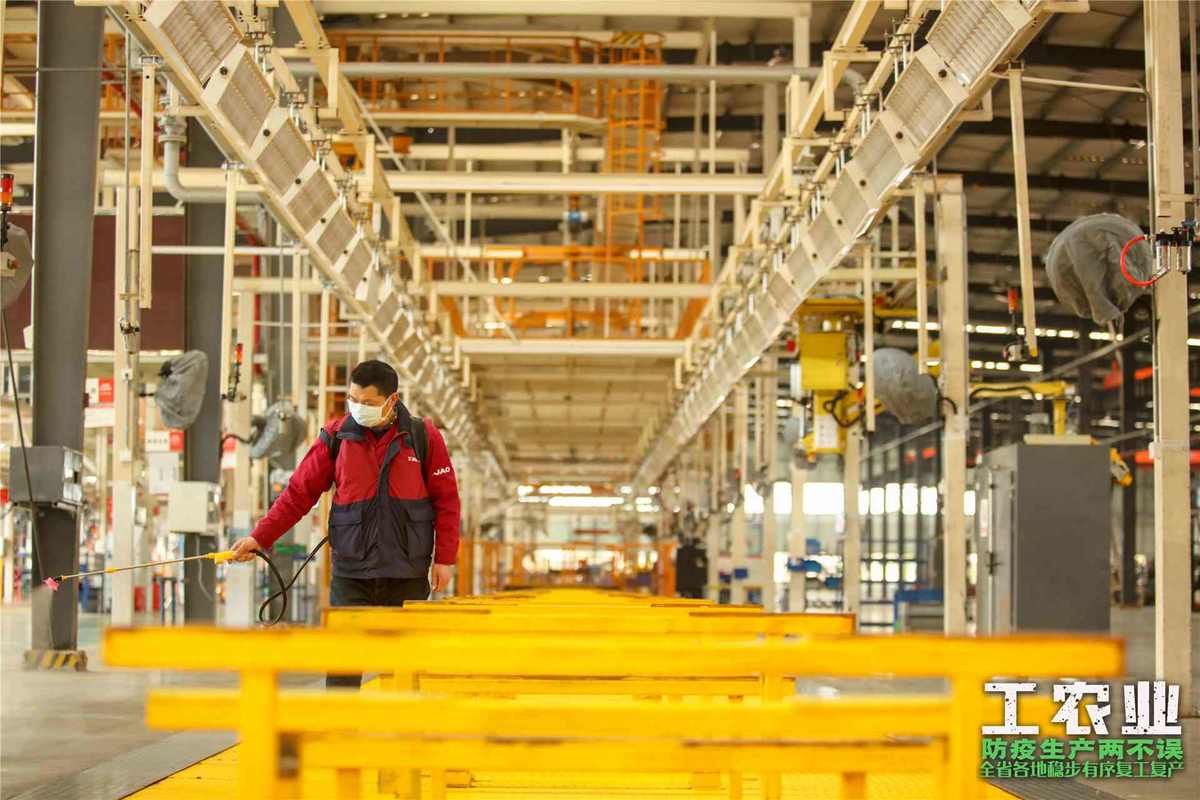 遂宁市安居区江淮汽车车间内,工作人员正在为生产车间消毒,全力保障复工生产。