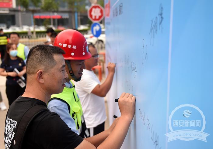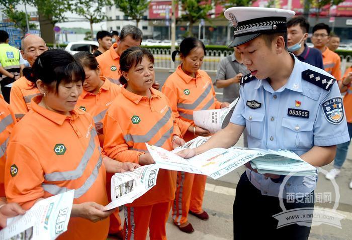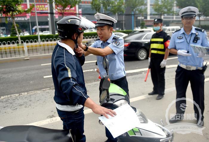 7月18日,交警曲江大队、地铁八号线1标段指挥部、中建八局四分部,联合在地铁长鸣路车站开展“民有所呼,我有所应,三方共建,安畅出行”交通安全主题宣传活动。通过向过往市民免费赠送电动车安全帽、发放交通安全宣传册等形式,号召和引导在建地铁沿线附近群众,遵守交通法规、提高安全意识、维护交通秩序,行安全路、做文明人。图为交警对骑电动车不带安全帽的市民群众进行宣传教育并赠送安全帽。西安报业全媒体记者 冯炜 摄