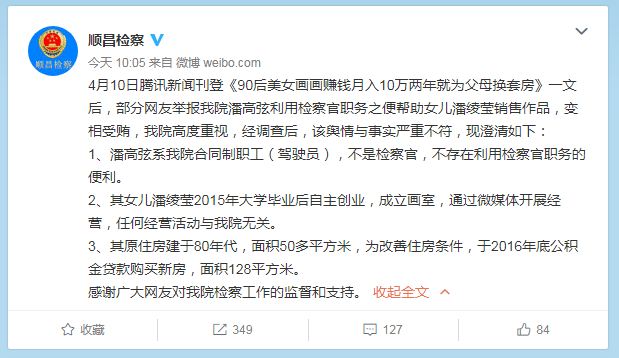 @顺昌检察4月11日消息,4月10日腾讯新闻刊登《90后美女画画赚钱月入10万两年就为父母换套房》一文后,部分网友举报我院潘高弦利用检察官职务之便帮助女儿潘绫莹销售作品,变相受贿,我院高度重视,经调查后,该舆情与事实严重不符,现澄清如下: