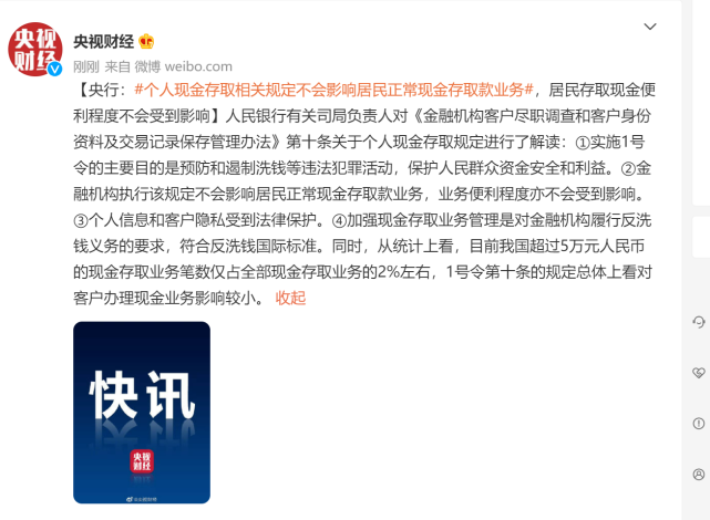 人民银行有关司局负责人对《金融机构客户尽职调查和客户身份资料及交易记录保存管理办法》第十条关于个人现金存取规定进行了解读:实施1号令的主要目的是预防和遏制洗钱等违法犯罪活动,保护人民群众资金安全和利益。金融机构执行该规定不会影响居民正常现金存取款业务,业务便利程度亦不会受到影响。个人信息和客户隐私受到法律保护。加强现金存取业务管理是对金融机构履行反洗钱义务的要求,符合反洗钱国际标准。同时,从统计上看,目前我国超过5万元人民币的现金存取业务笔数仅占全部现金存取业务的2%左右,1号令第十条的规定总体上看对客户办理现金业务影响较小。