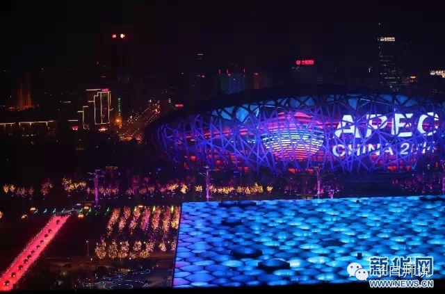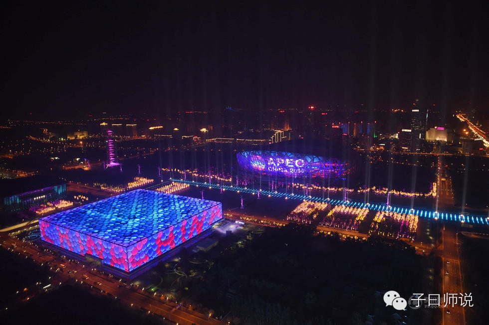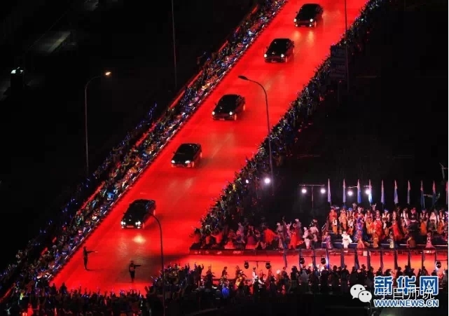 11月10号晚,璀璨的APEC之夜,水立方以APEC领导人非正式会议晚宴及文艺演出迎接贵宾,各国领导人陆续抵达水立方北门。现场用灯光打出了红毯,路边志愿者组成欢迎队伍载歌载舞,高唱《远方的客人请你留下来》。而这一晚的主题,就是:上善若水,同舟共济。