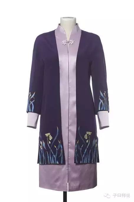 女领导人服装为立领、对襟、连肩袖,双宫缎面料、饰海水江崖纹外套。