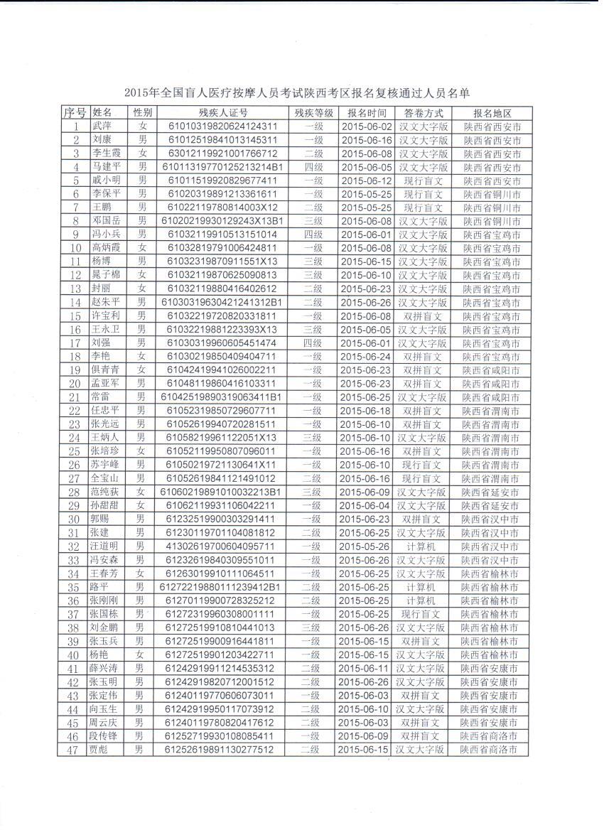 2015年全国盲人医疗按摩人员考试陕西考区报名复核通过人员公示