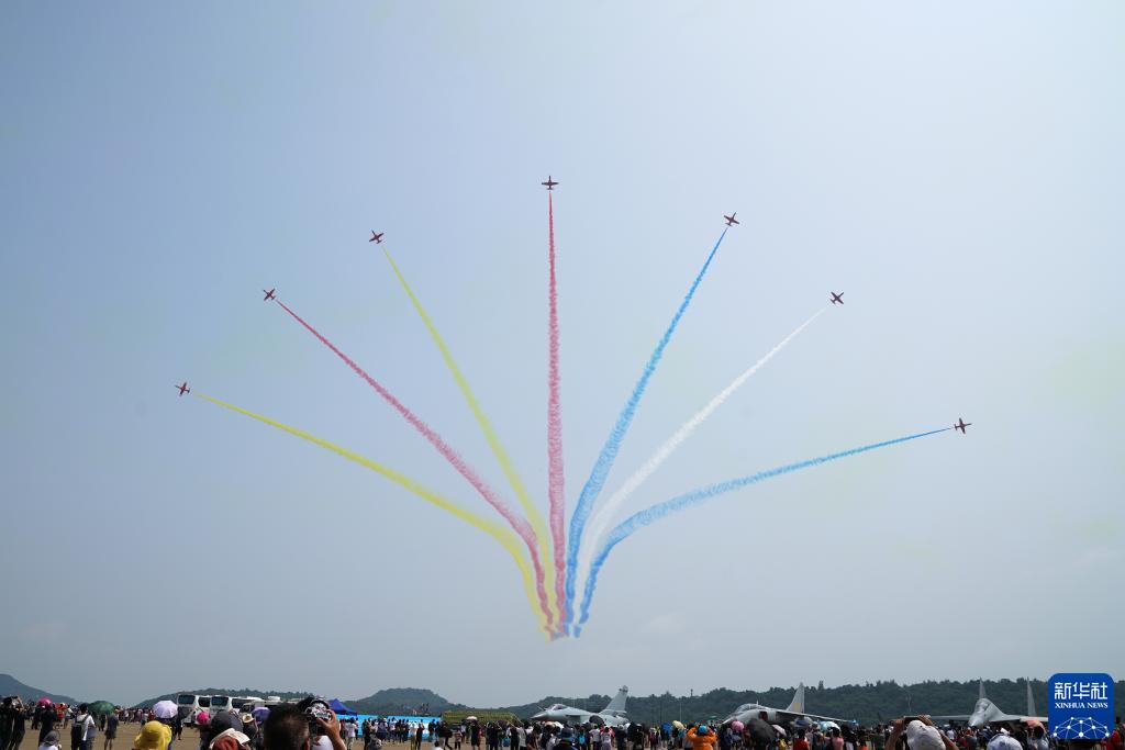 ”飞行表演队在第十三届中国国际航空航天博览会上进行飞行表演。