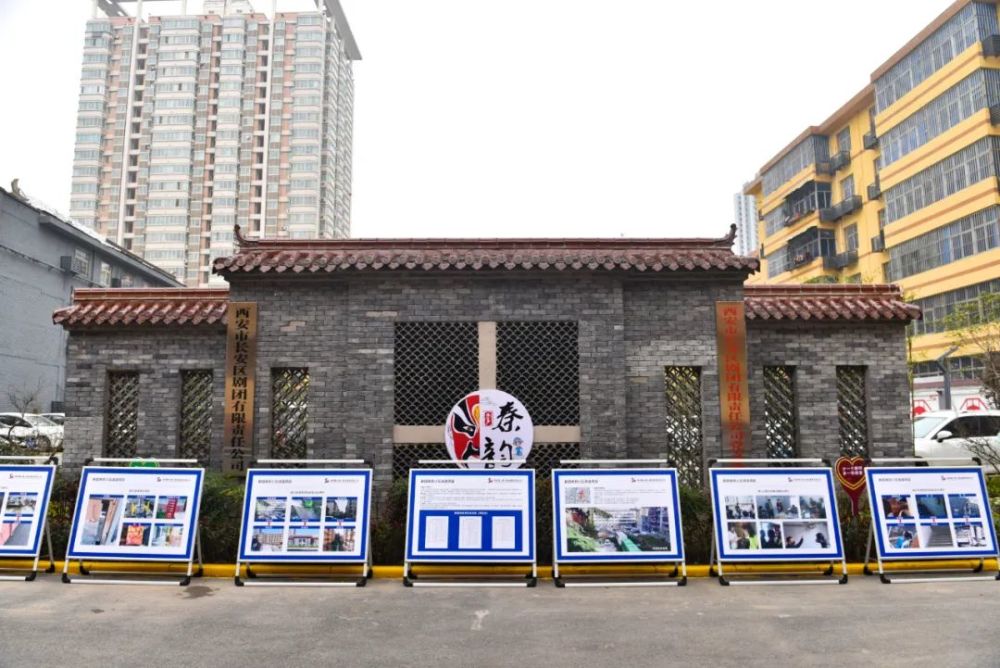 来到长安剧团小区,首先映入眼帘的是矗立在绿化带中古色古香的屏风,青砖红瓦配着秦韵秦风,戏剧主题巨幅墙体彩绘,传统文化气息扑面而来。