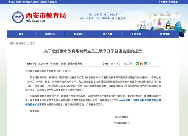 8月14日,西安市教育局发布《关于做好我市教育系统师生员工秋季开学健康监测的提示》,要求所有离开西安的中小学、幼儿园师生员工需在8月16日前返回,因以上人员均需满足返回西安后健康观察14天且身体健康的条件方可入校(园)。提示全文如下: