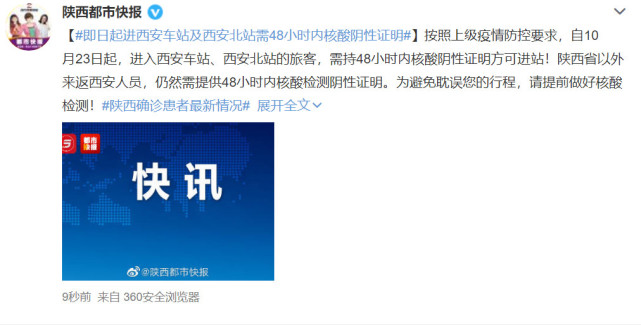 按照上级疫情防控要求,自10月23日起,进入西安车站、西安北站的旅客,需持48小时内核酸阴性证明方可进站!陕西省以外来返西安人员,仍然需提供48小时内核酸检测阴性证明。为避免耽误您的行程,请提前做好核酸检测!