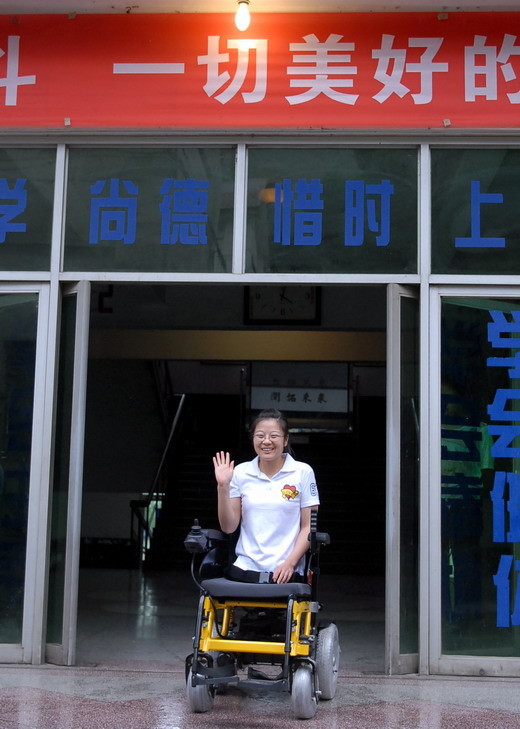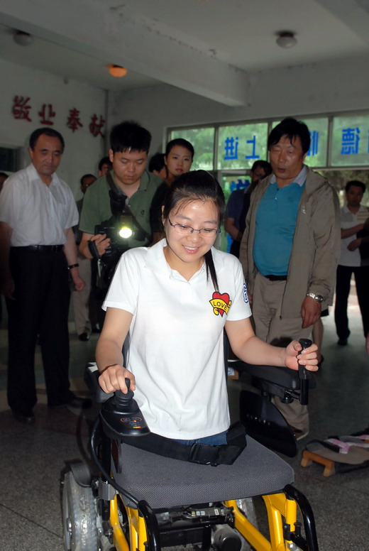 渭梅女喜获电动轮椅后,仔细研究进行试驾