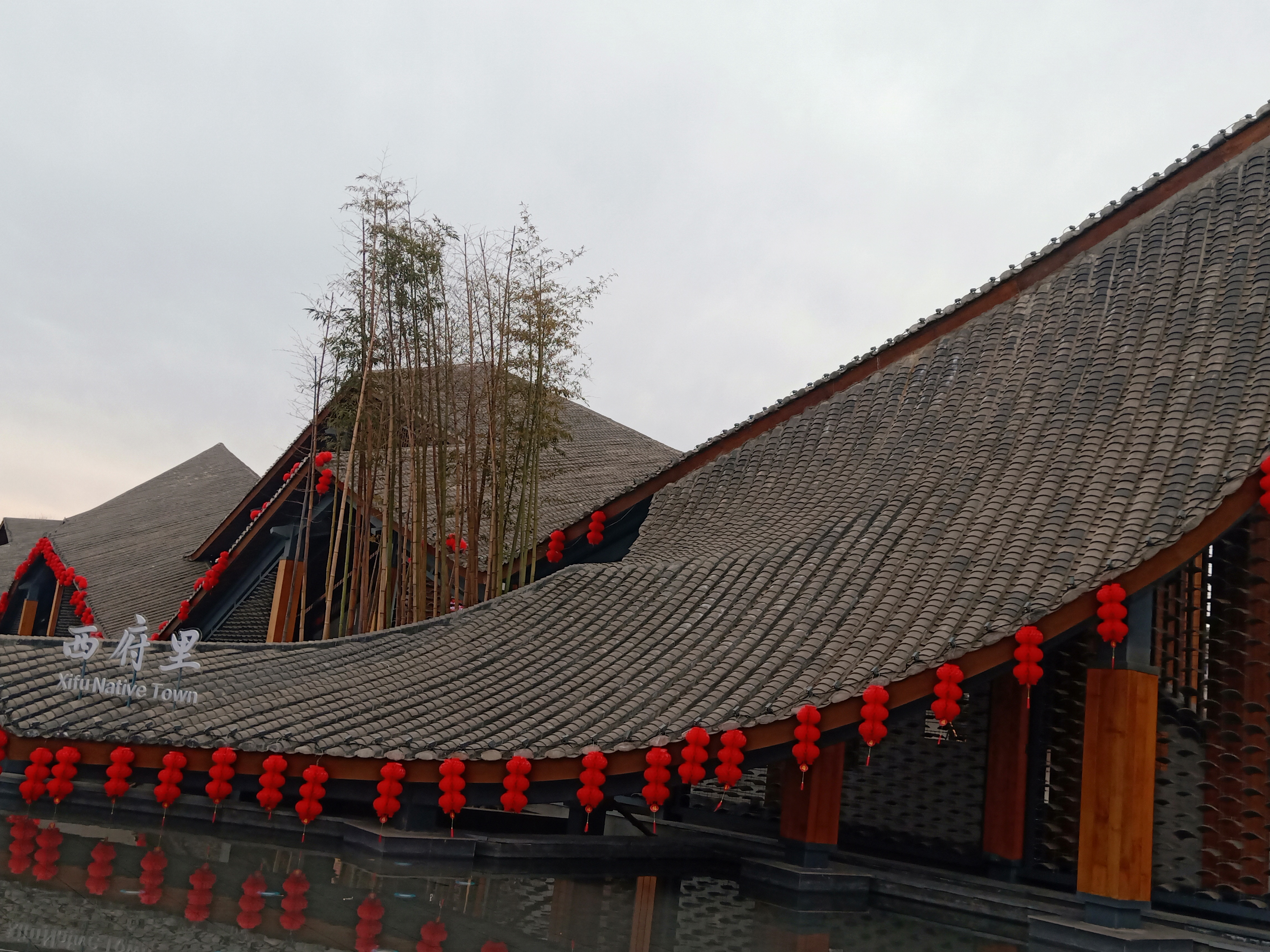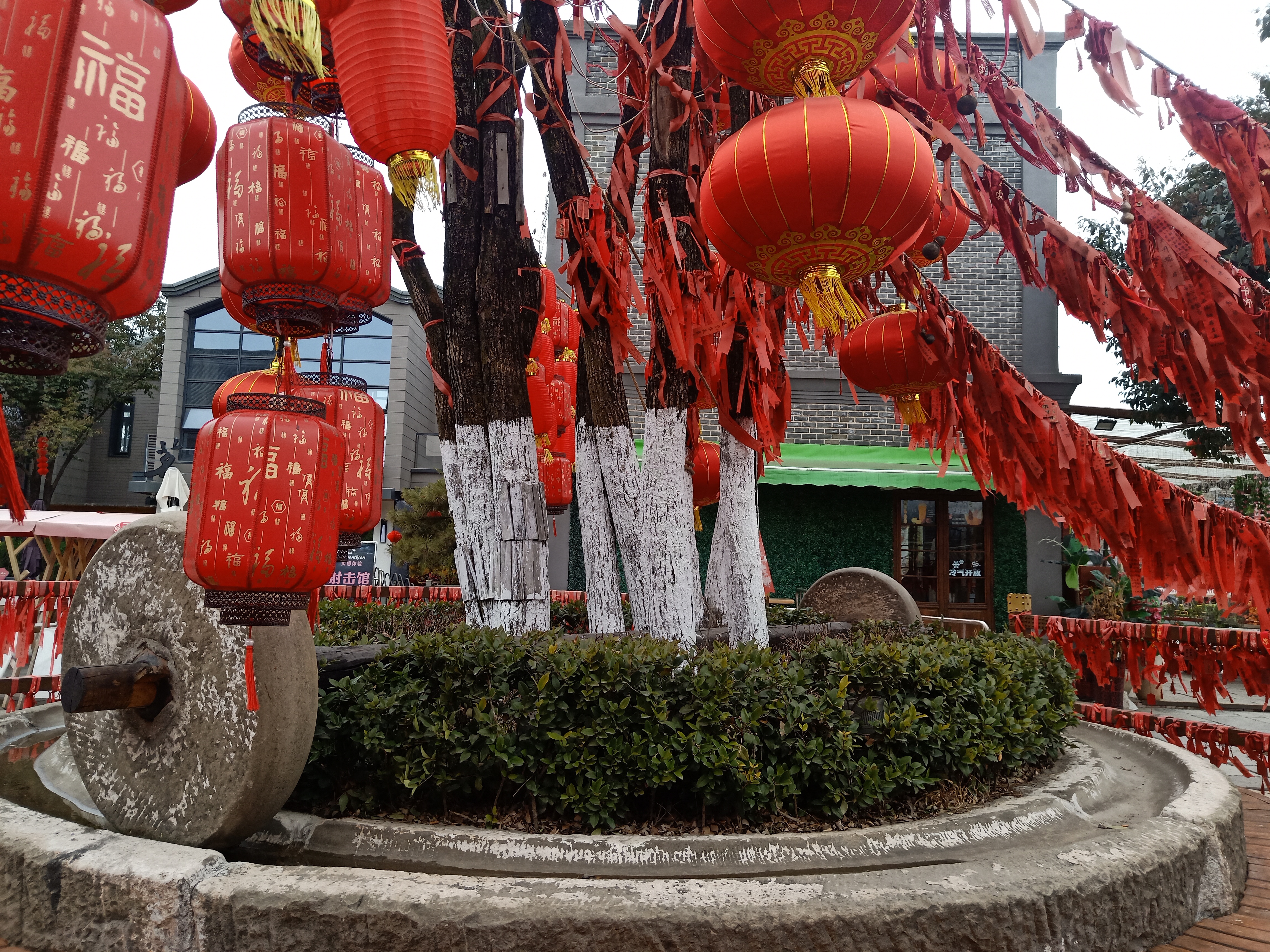 时值农历正月,年味犹在,社火艺人正在化妆,准备晚上的社火表演。老街中心,整座搬迁过来的老戏楼雕梁画栋,彩绘鲜艳,戏楼背后是一面大型砖雕,邀请全国著名的砖雕大师雕刻了明清时期老宝鸡地图,雕刻时光,记录历史。观者站在老街砖雕前一览老宝鸡全貌。各家商铺前的红色旗幡、红色长串灯笼为老街增添了浓厚的年味;十全十美的同根树上,挂满了游客的红色祈福带,祈祷家人平安康健。