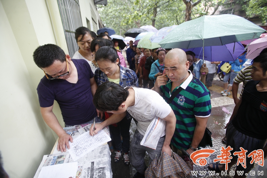 2015年6月23日,西安市金花北路。冒雨排队的家长在领到一张盖有学校印章的票号后,才意味着孩子上学有了眉目。华商报记者 赵航 摄