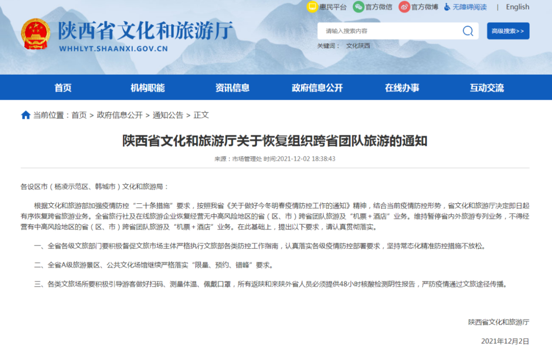 记者今天(12月2日)从陕西省文化和旅游厅获悉,即日起陕西恢复跨省旅游业务。所有返陕和来陕外省人员必须提供48小时核酸检测阴性报告。