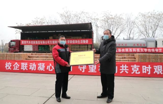 近期,西安疫情防控形势严峻,高校师生的安全健康更是牵动各级政府和众多爱心企业的心。1月2日下午,省委组织部会同省国资委召开了国资国企支持疫情防控视频会议,部署了企业—高校“一帮一”对口帮扶活动,确定由陕西汽车控股集团有限公司对口支援我校。陕西汽车控股集团有限公司高度重视、迅速响应,成立了由董事长袁宏明任组长的帮扶陕西科技大学疫情防控工作领导小组,第一时间联系我校了解需求,短短两天时间里,就筹措了大量保障物资,捐赠物资总价值111.1万元。首批援助的物资包括医用外科口罩10万个、N95口罩1万个、医用防护服1000套、免洗手消毒凝胶5010瓶、米面油800份、新鲜蔬菜6吨、防疫消杀车辆1辆。尤其是价值55万元的专业消杀车辆,即是陕汽的特色产品,又属于“以销定产”产品,由陕西汽车控股集团有限公司董事长袁宏明亲自安排,协调上配公司在湖北随州加班加点装配,连夜从湖北送达学校,及时地解决我校专业消杀设备紧缺的难题,有力地缓解了我校疫情防控物资短缺的困难,恰于小寒时节送来温暖援助。