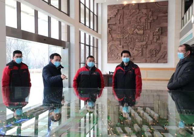 捐赠仪式前,姚书志向陕西汽车控股集团有限公司袁宏明一行讲解学校沙盘模型、介绍学校基本情况。